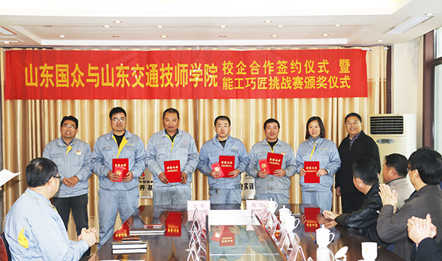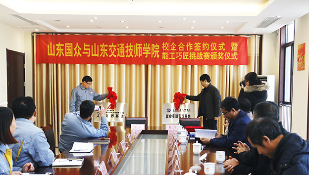 2016年12月6日,山東國眾與山東交通技師學(xué)院校企合作暨山東交通技師學(xué)院第四屆技能節(jié)“能工巧匠”挑戰(zhàn)賽頒獎儀式在公司舉行。山東交通技師學(xué)院副院長任東等校方領(lǐng)導(dǎo)一行參加了本次校企合作揭牌儀式暨頒獎儀式,公司總經(jīng)理謝文成、常務(wù)副總經(jīng)理劉文吉、崔新平等公司領(lǐng)導(dǎo)及受獎員工部門長等參加了儀式活動。公司常務(wù)副總經(jīng)理劉文吉主持儀式。